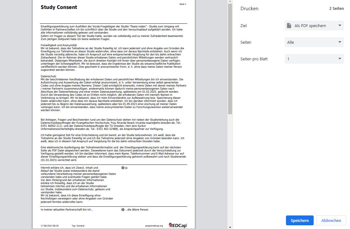 Oft kann es wichtig sein, einen Consent in einem REDCap Projekt einzubauen, um den Prband:innen zu verdeutlichen, dass sie bei einer Nutzung von Institutsrechnern/Tablets deren gesamte Struktur nutzen. Zur Einarbeitung eines solchen Consent, werden Ihnen die folgenden Bilder einen Überblick verschaffen. Klicken Sie die Bilder an und erhalten eine vergrößerte Auflösung.